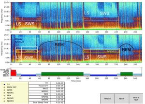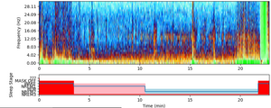REM sleep is usually easy to identify in the spectrogram, especially within the core of a sleep cycle. REM episodes occur between NREM stages and are marked by a distinctive bow-shaped frequency band around 20–25 Hz near the end of the cycle.
