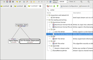 Disconnect and close the Acquisition Server window. Then run ./bin/openvibe-designer. Go to File -> New. In the search bar, type "acquisition" and drag Acquisition Client to the design workspace (to the left side of the interface). Repeat this process for Signal Display and CSV File Writer (Deprecated). Note: the deprecated CSV File Writer is required for compatibility with other software.